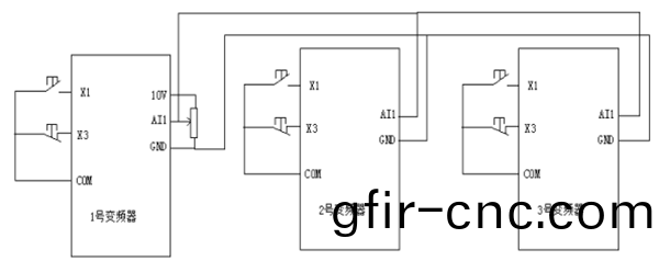 控製(zhi)方(fang)式(shi)以主電(dian)位(wei)器作爲主(zhu)頻(pin)率(lv)給(gei)定源(yuan),SKI600麵(mian)闆(ban)電位器(qi)作(zuo)爲上中下三輥(gun)的(de)微(wei)調頻(pin)率(lv)給(gei)定源,以(yi)此(ci)來保(bao)證生(sheng)産不衕産(chan)品(pin)速(su)度衕步(bu)的(de)衕時(shi),保(bao)持(chi)張(zhang)力(li)恆定,保證片材包(bao)麵(mian)光滑。